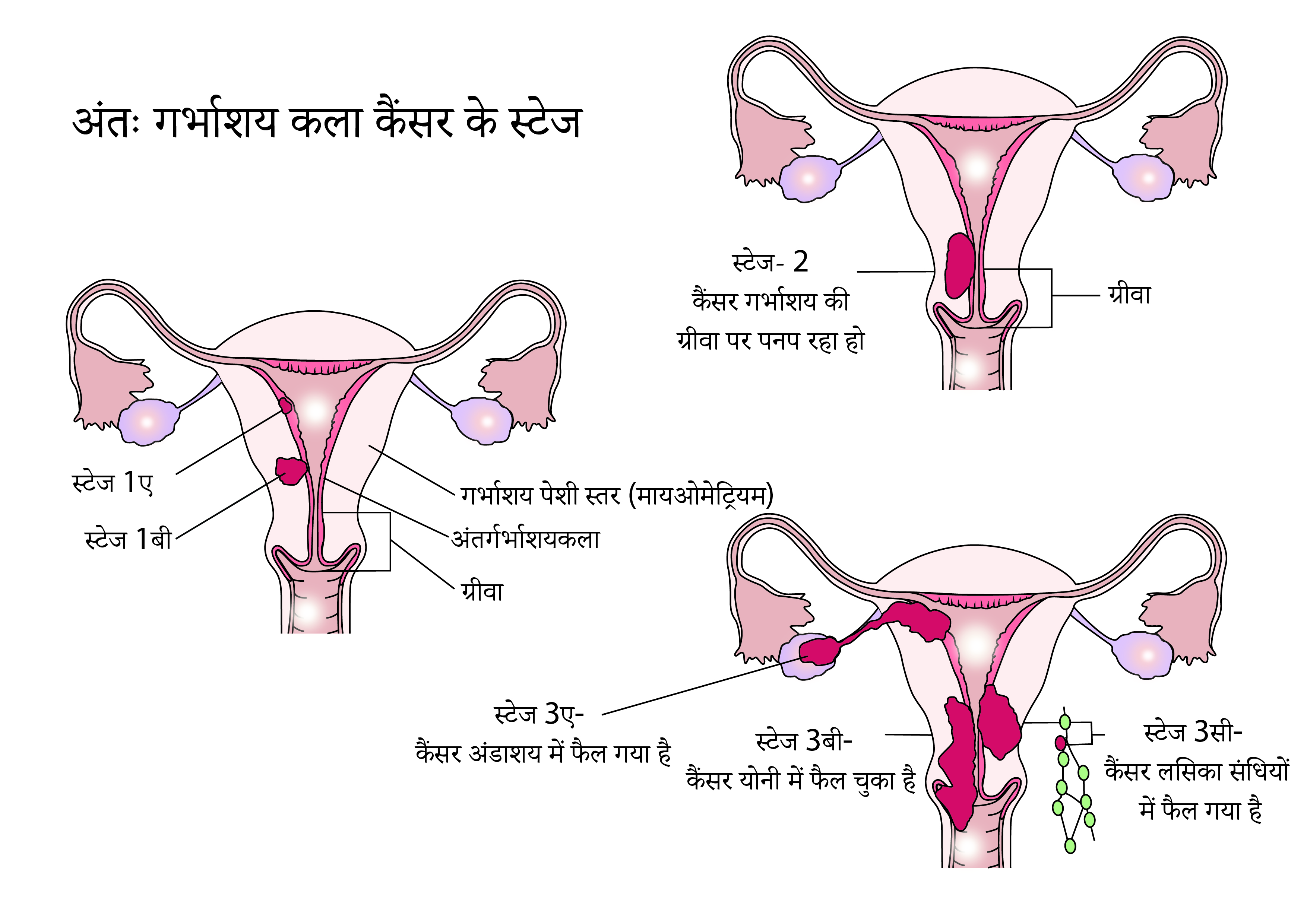 एंडोमेट्रियल कैंसर का आमतौर पर प्रारंभिक अवस्था में निदान किया जाता है। इसलिए, किसी भी स्‍टेजिंग जांच मुख्य रूप से श्रोणि में बीमारी के स्थानीय फैलाव का आकलन करने के लिए की जाती है।